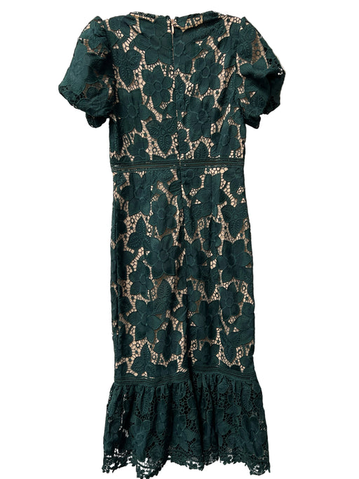View full detailsJust Me Size Small Green & Tan Polyester Lined Overlay Back Zip V Neck Dress
