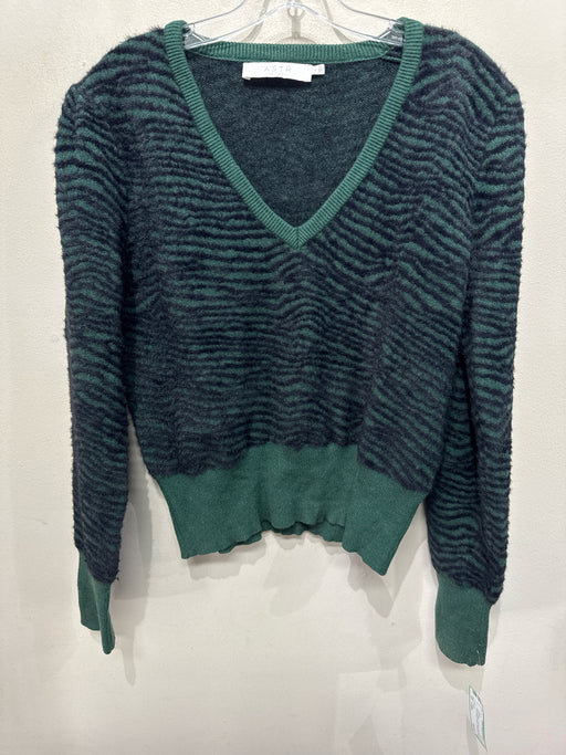 View full detailsASTR Size Large Green & Black Polyester Long Sleeve Animal Stripe V Neck Sweater