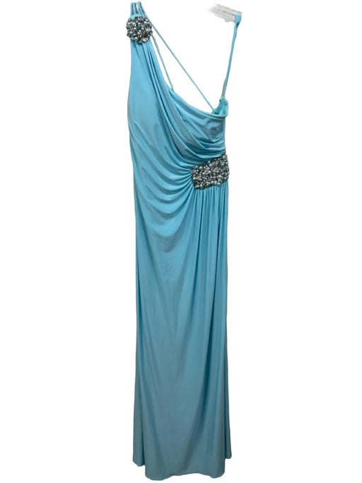 View full detailsCache Size 4 Aqua Blue Polyester One Shoulder Pearl Detail Side Zip Strappy Gown